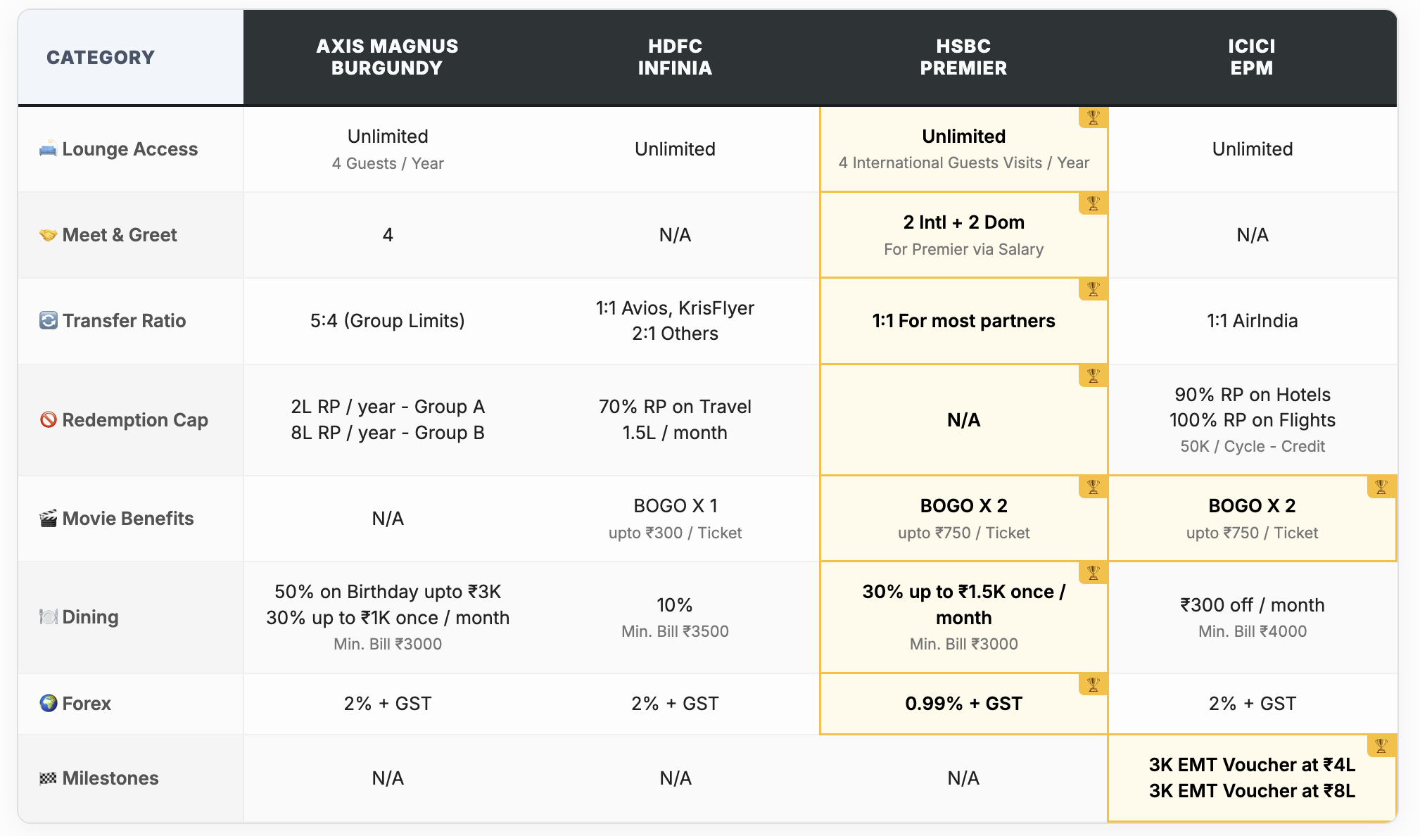 Lounges, meet & greet, movies, dining offers, and forex charges.